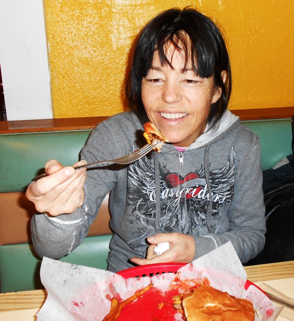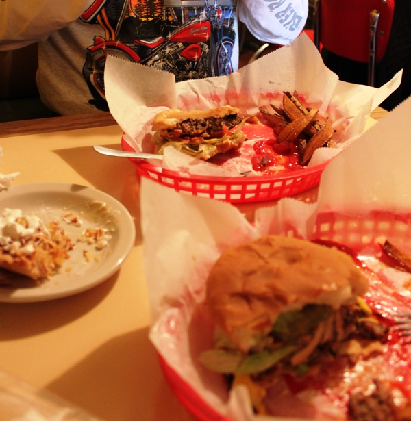 The fare was mostly burgers, so we both ordered burgers, fries and split a piece of coconut pie. Since it took awhile for the food to get to us, we began eating immediately when it arrived. So we forget to get the full plate picture.