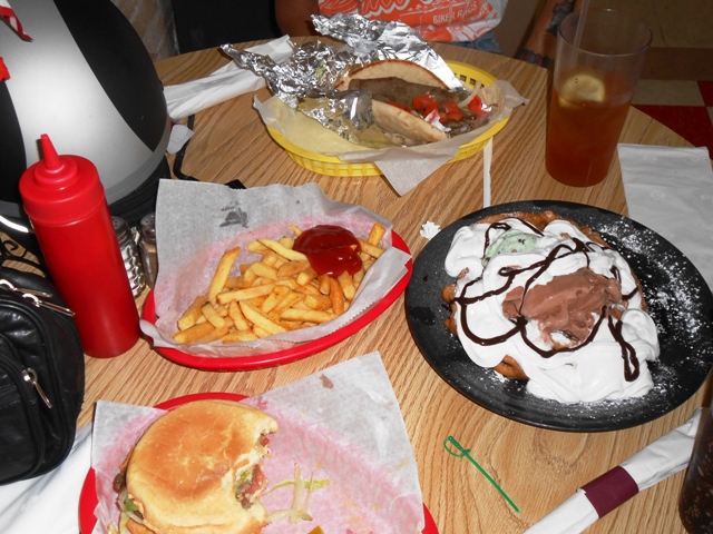 The cloud nine is a funnel cake with ice cream, whipped cream and chocolate syrup. Frankly, the dessert put us way over the top, but Jeff says it’s OK to go wild when you’re out of town. (I say, next ride, we try for more vegetables!) Of course, we enjoyed lunch.