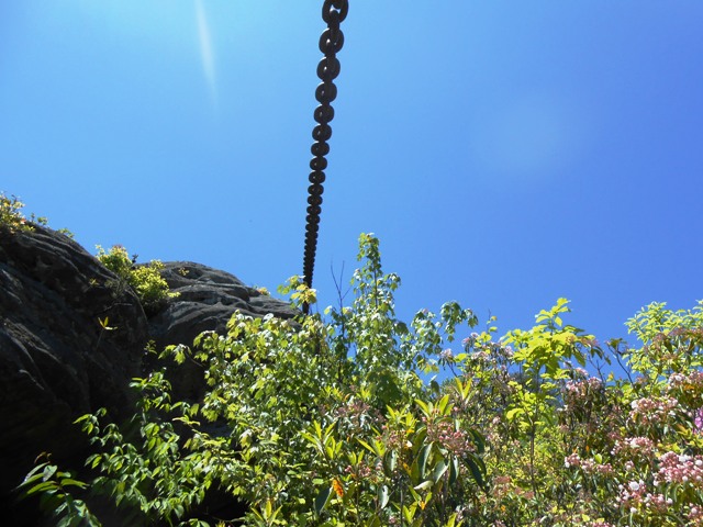 - In southeastern Kentucky’s Bell County, high on the vaulted slopes of Pine Mountain a large rock outcropping looms menacingly over the small town of Pineville. For years Chained Rock had been a part of area mountain folklore. But, in the 1930’s it became a genuine legend when a feat of the newly formed Chained Rock Club was reported in countless newspapers across the country. As the legend goes, the town’s children had for years been told that the rock hanging ominously above town could not give way and come tumbling down on them as they slept because it had been ‘chained’. In truth, however, the boulder had never been secured, but events in 1932 changed that forever when the mighty boulder was harnessed by an enormous chain. The hike down to Chained Rock is .3 miles one way and affords majestic views of the surrounding Cumberland Mountains.