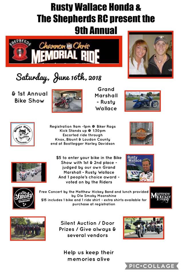 The Channon & Chris Memorial Ride is a fantastic fundraising event with a beautiful spirit behind it. All of this year’s proceeds go to UT Hospital Neonatal Department and St. Jude Hospital.