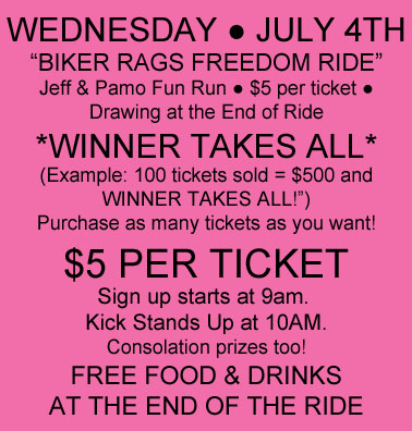The ride is this Wednesday, July 4th. Sign up starts at 9am and we’ll all leave together at 10am. We’ll go on a 80 mile round trip ride and be back at Biker Rags between 12:30pm to 1pm. It’s $5 a ticket and winner takes all!