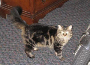 We found Jerry Cheese at 4 weeks of age in the woods behind Biker Rags. We think he is a litter mate of Fluffer. He is tall and skinny and loves to play with the other cats. He’s our favorite!
